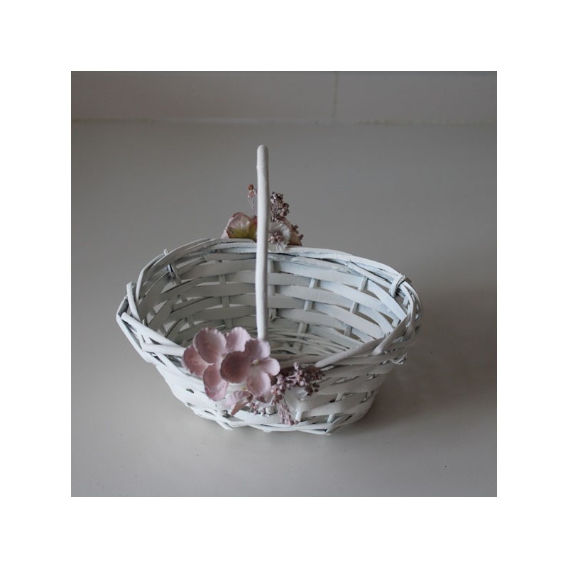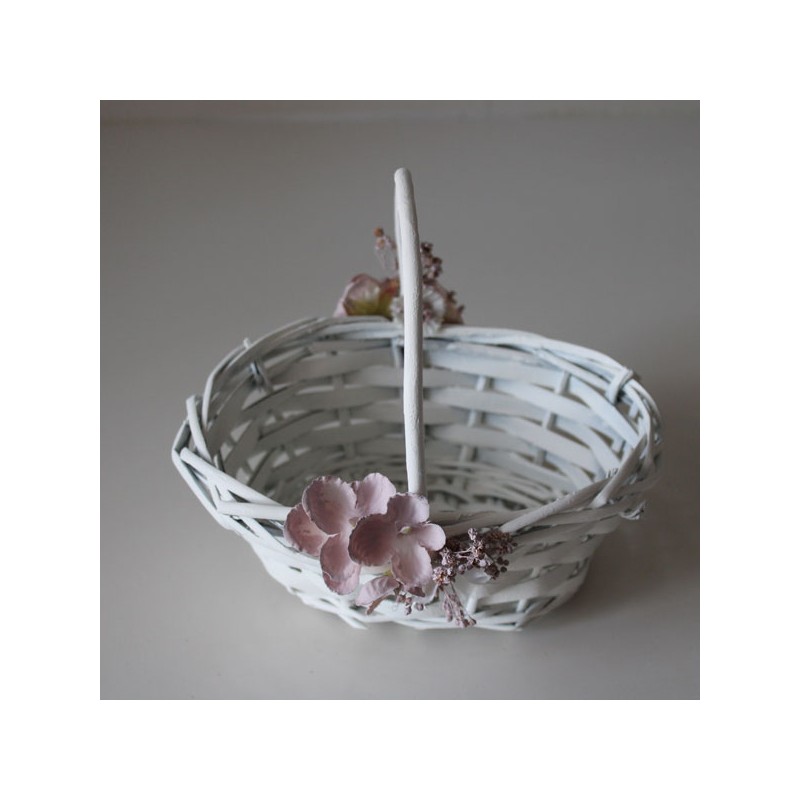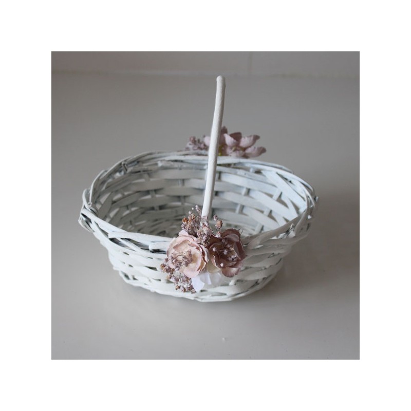 Cesta de mimbre ovalada pintada en blanco para las niñas de arras, decorada con flores rosa empolvado.