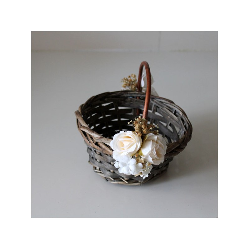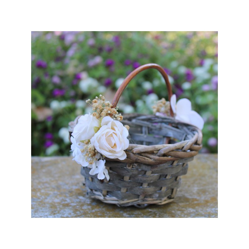 Cesta de mimbre redonda para las niñas de arras, decorada con rosas marfil.