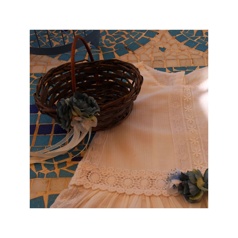 Cesta de mimbre ovalada para las niñas de arras, en mimbre y decorada con rosas azules.