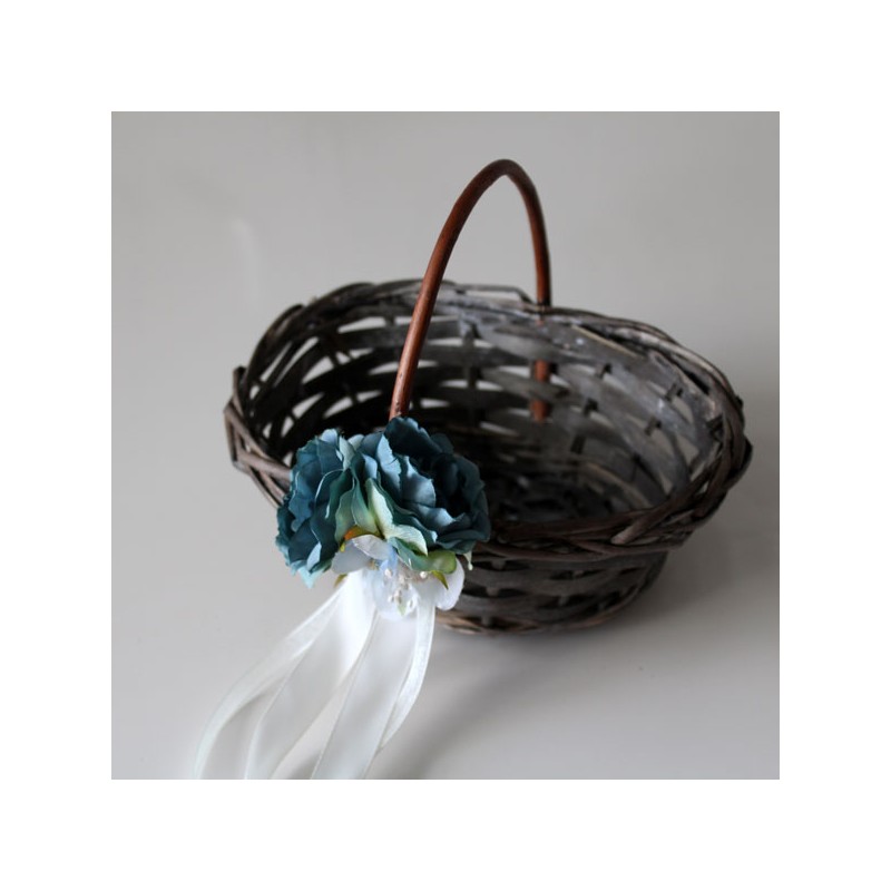 Cesta de mimbre ovalada para las niñas de arras, decorada con rosas azules.