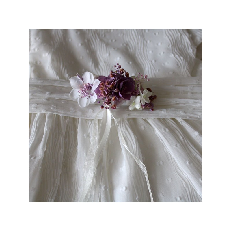 Prendido de flores secas de diversos tipos de flores en tonos malva empolvado para niña de arras.