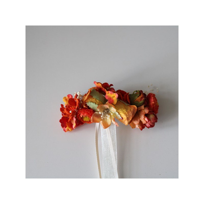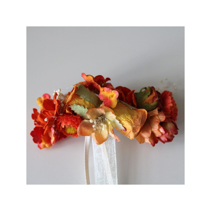 Pasador de flores de diversos tipos de flores en tonos naranjas para niña de arras y para eventos y pequeñas invitadas.