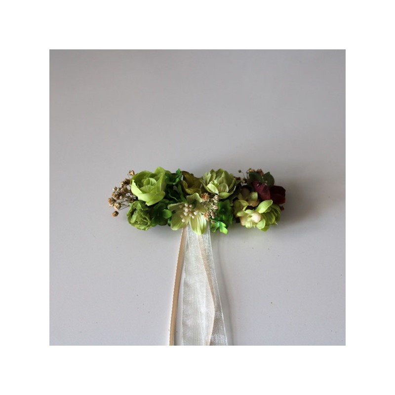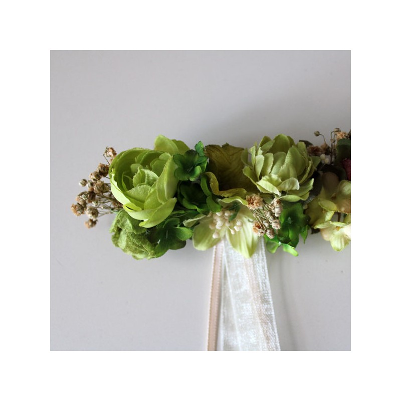 Cinturón mini de flores de diversos tipos de flores en tonos verdes para niña de arras y para eventos y pequeñas invitadas.