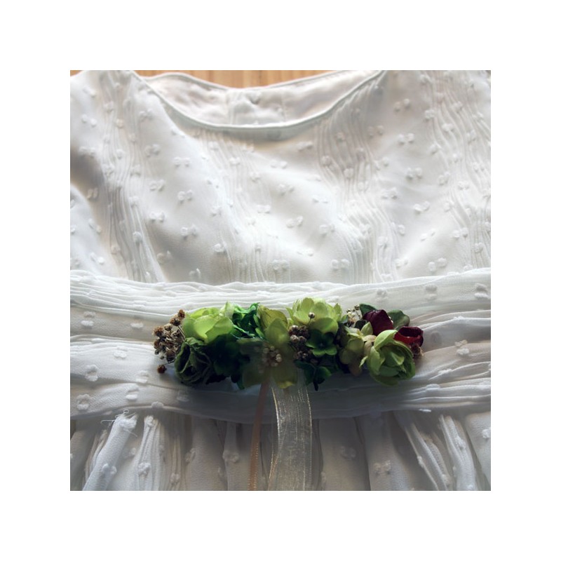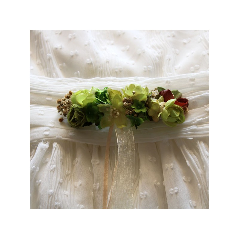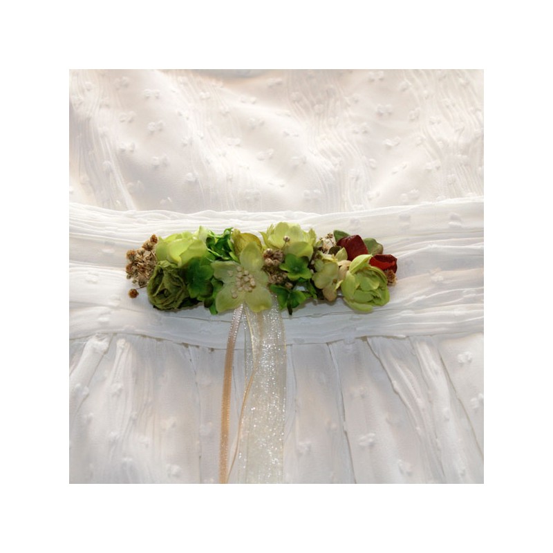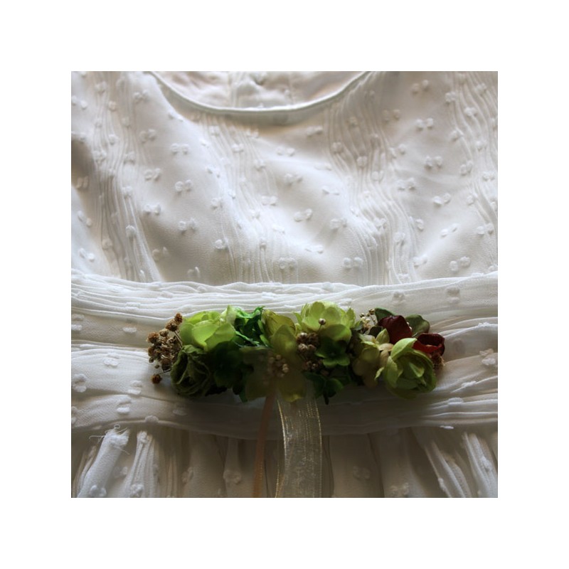 Cinturón mini de diversos tipos de flores verdes para niña de arras.