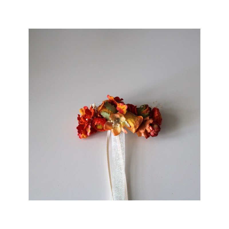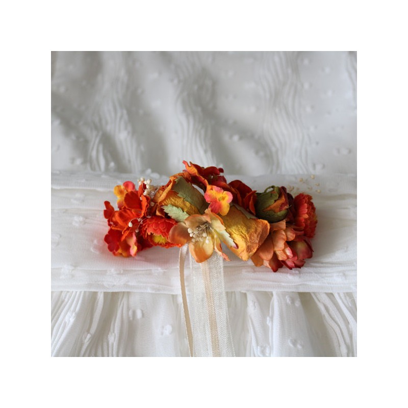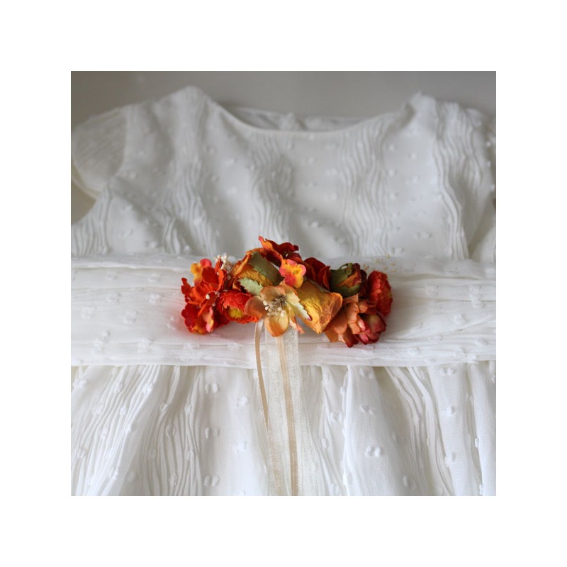 Cinturón mini de flores de diversos tipos de flores en tonos naranjas para niña de arras y para eventos y pequeñas invitadas.