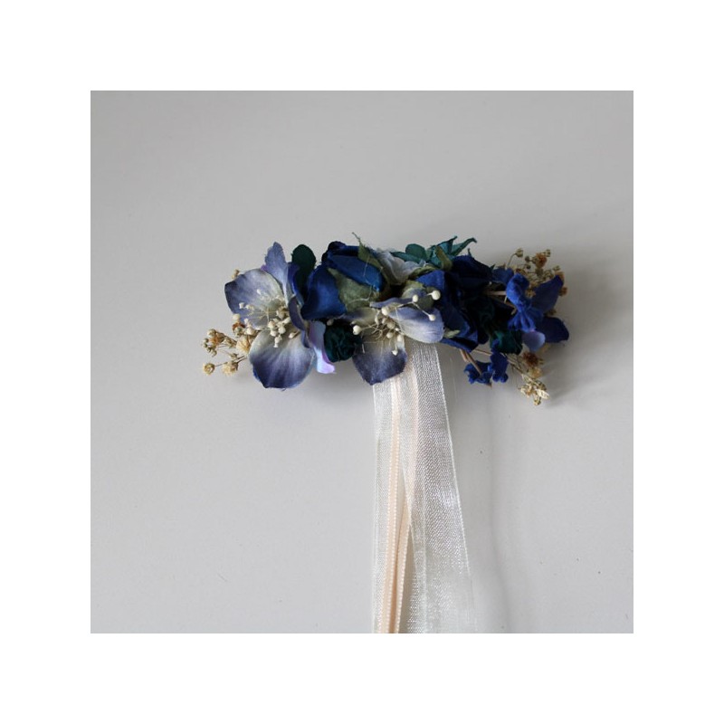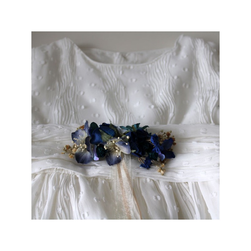 Cinturón pequeño de flores de diversos tipos de flores en tonos azulón para niña de arras y para eventos y pequeñas invitadas.