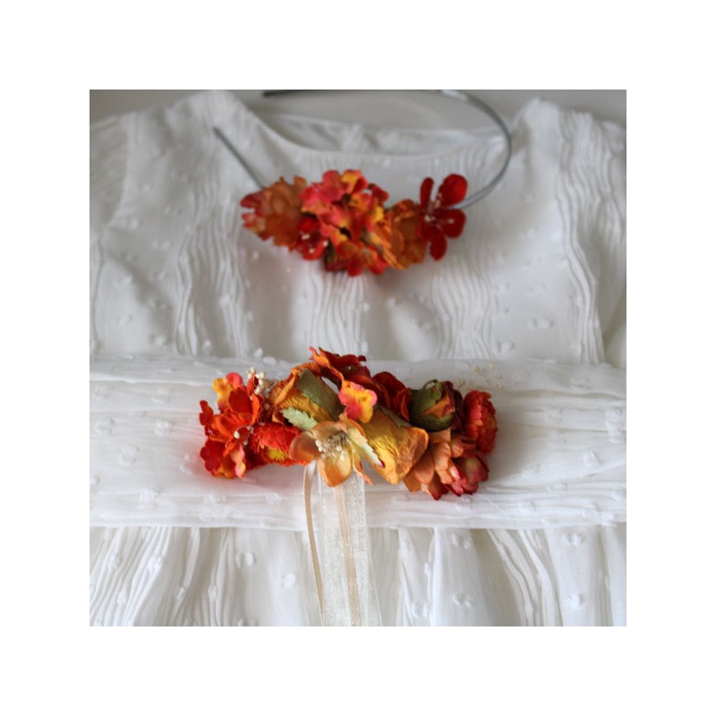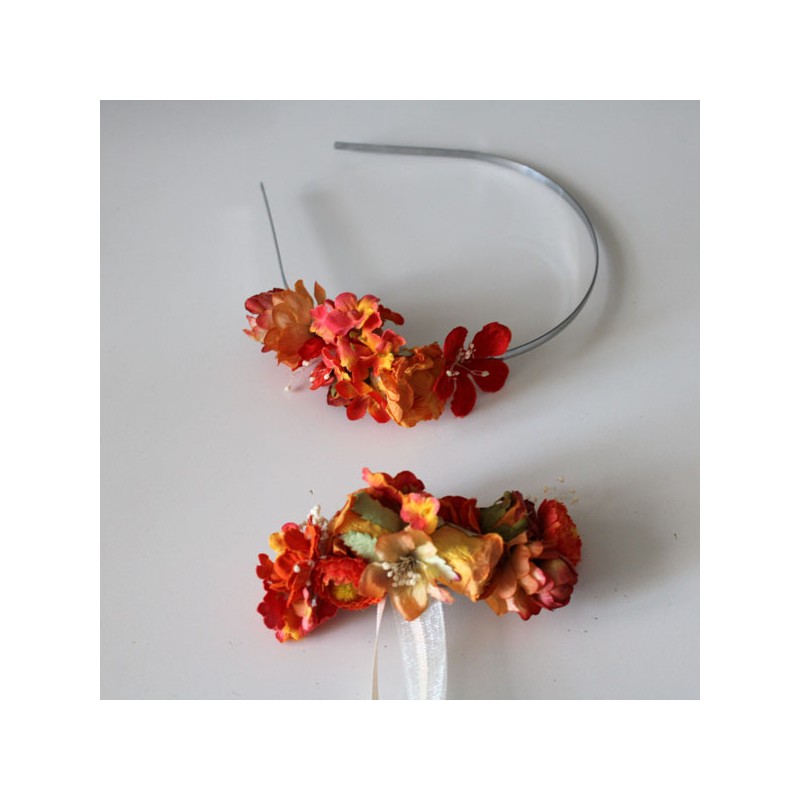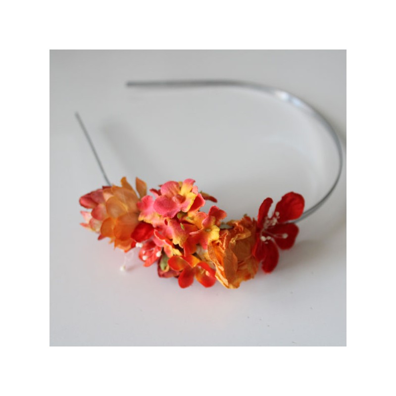 Diadema estrecha metal de flores laterales en tonos naranjas para acompañante o boda.