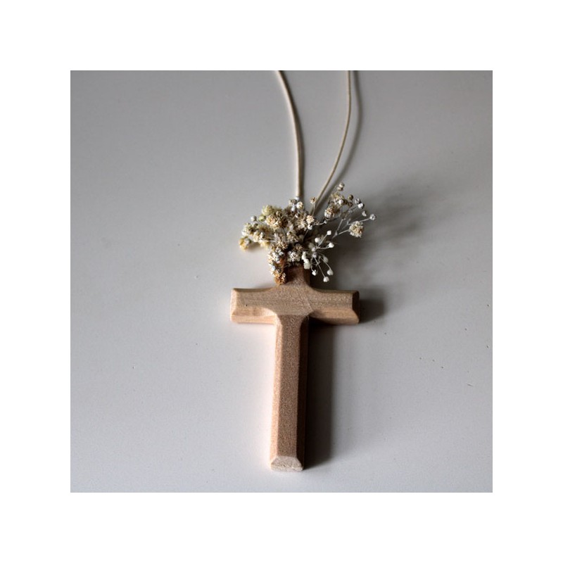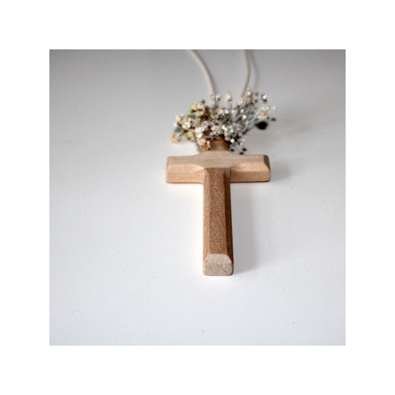 Cruz de madera natural con semillas marfil y tostado y cordón marfil para niñas de primera comunión.