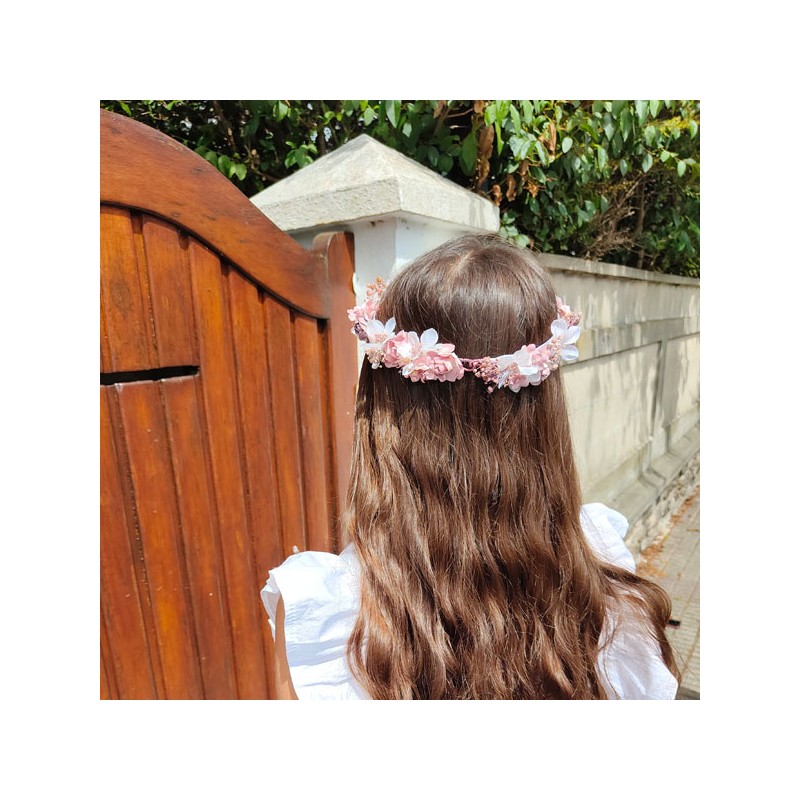 Corona popurri de flores rosa viejo, blanco roto y vainilla para niñas de primera comunión y para arras