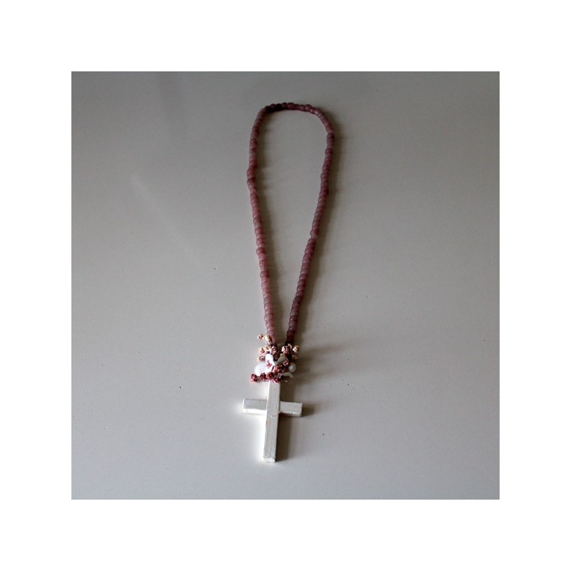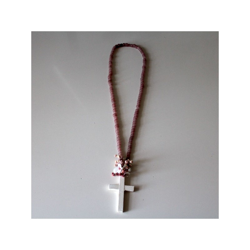 Collar de cuentas de vidrio reciclado rosa empolvado con cruz de madera en blanco roto para niñas de primera comunión