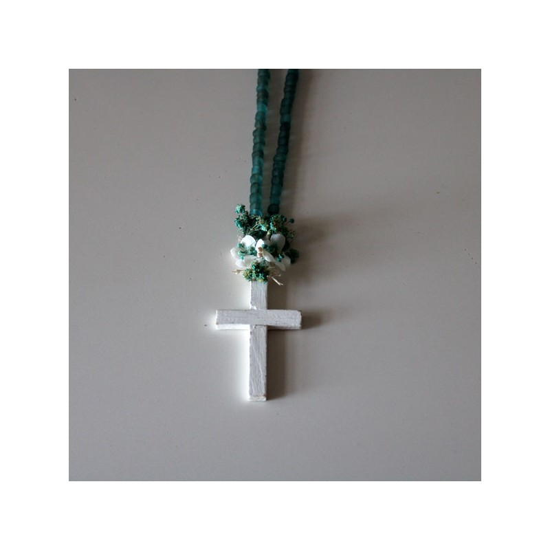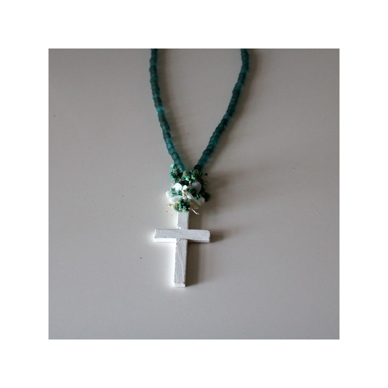 Collar de cuentas de vidrio reciclado azul verdoso empolvado con cruz de madera en blanco roto para niñas de primera comunión