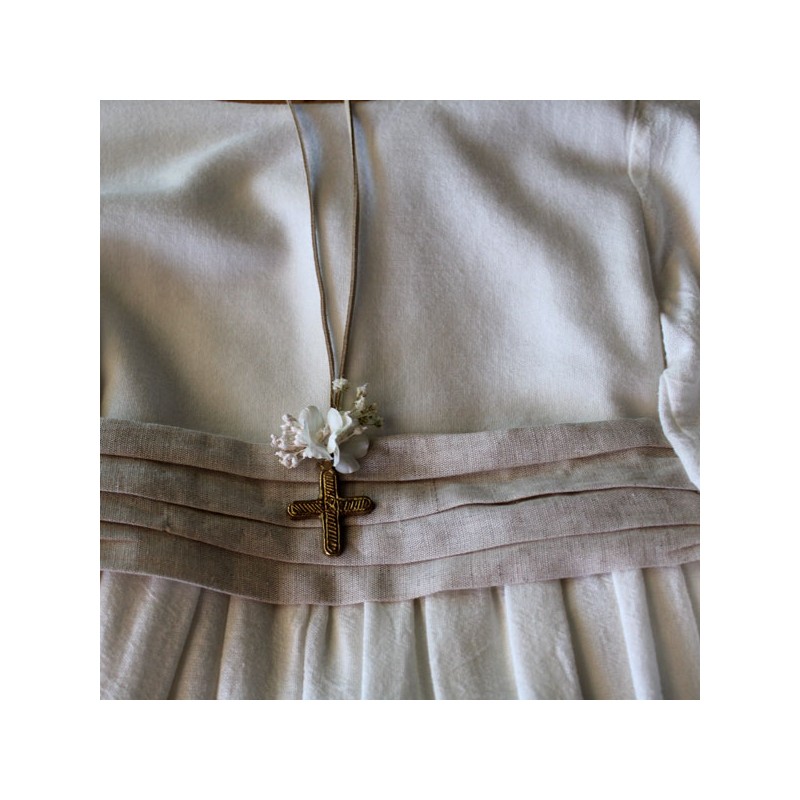 Cruz pequeña dorada tipo medieval con flor blanco roto y cordón de ante beige para niñas de primera comunión.