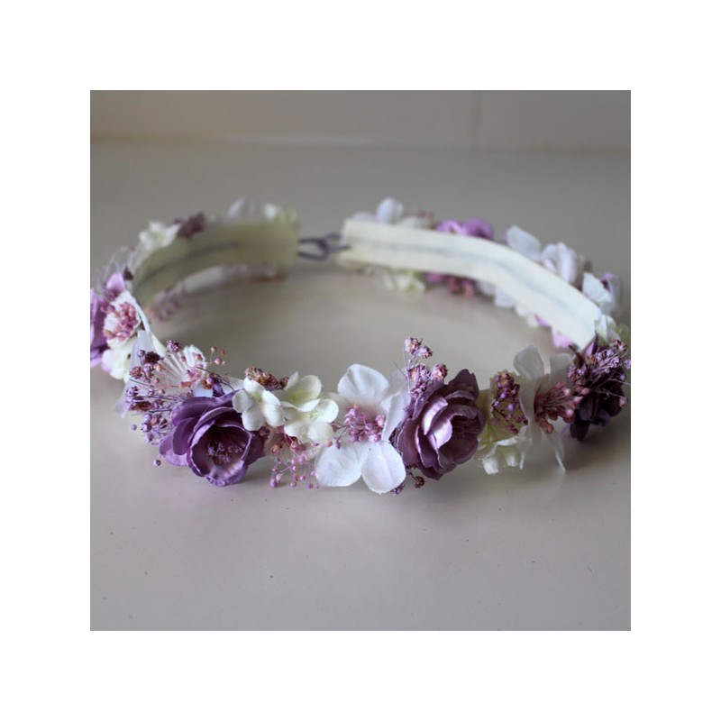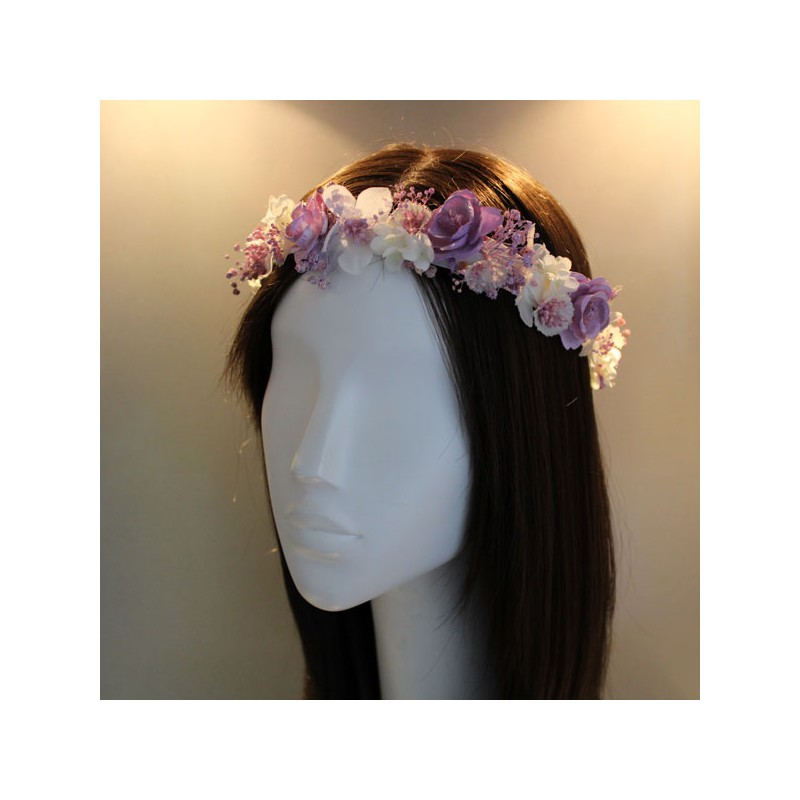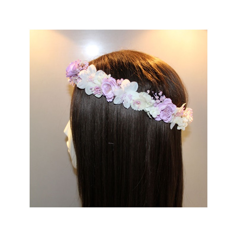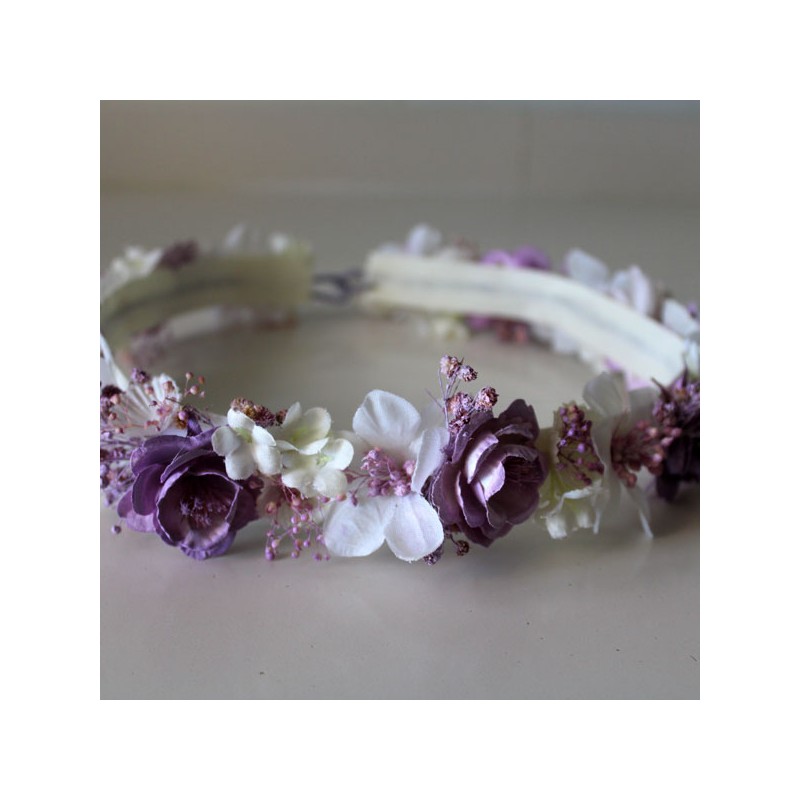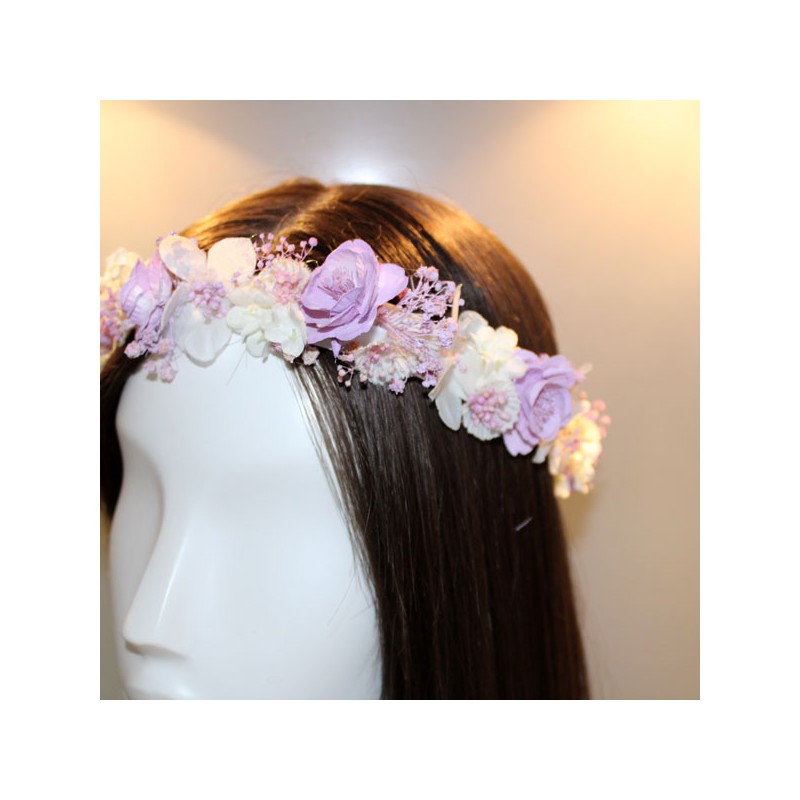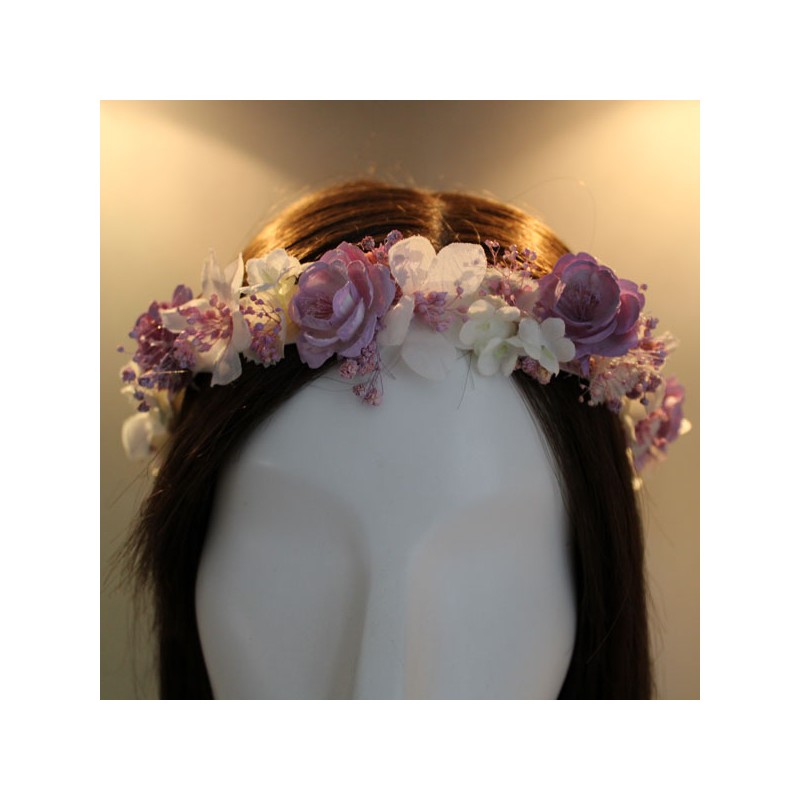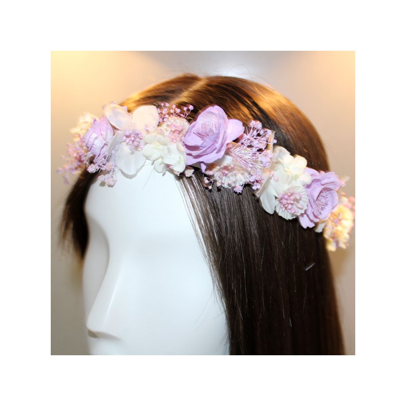 Corona popurri de flores malva, blanco roto y vainilla para niñas de primera comunión y para arras