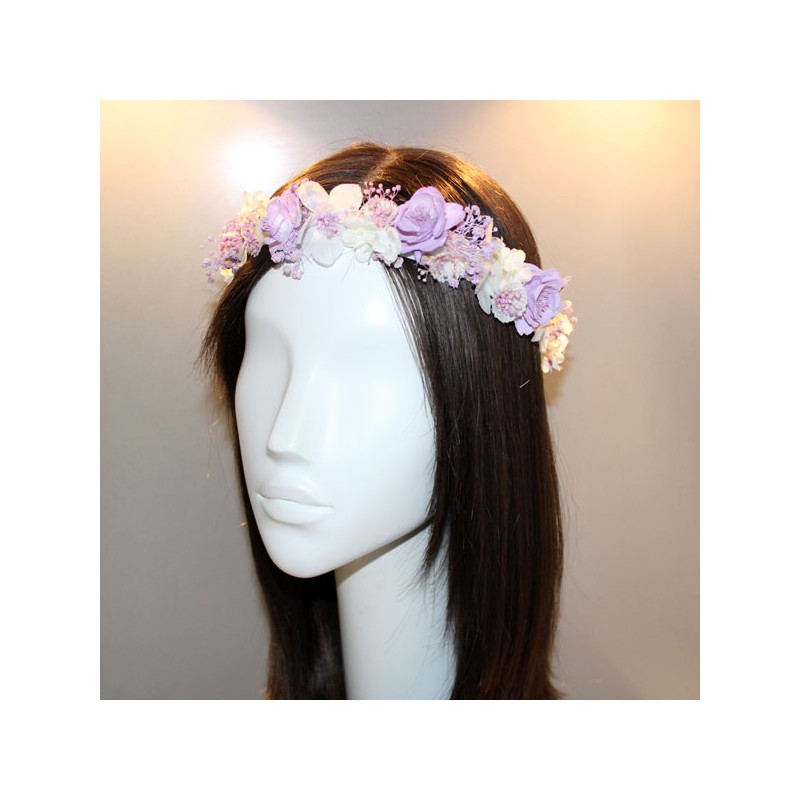 Corona de flores para comunión y arras Modelo flor popurri en malva, blanco roto y vainilla.