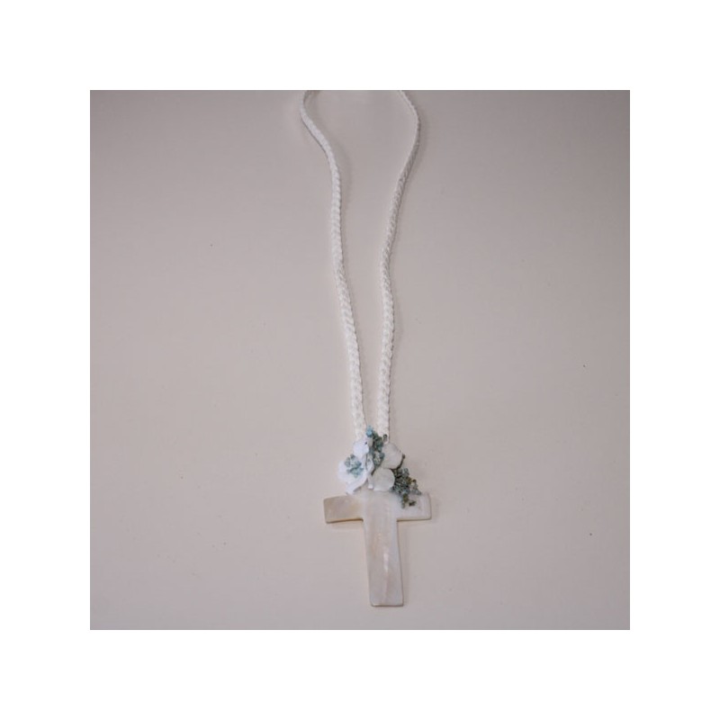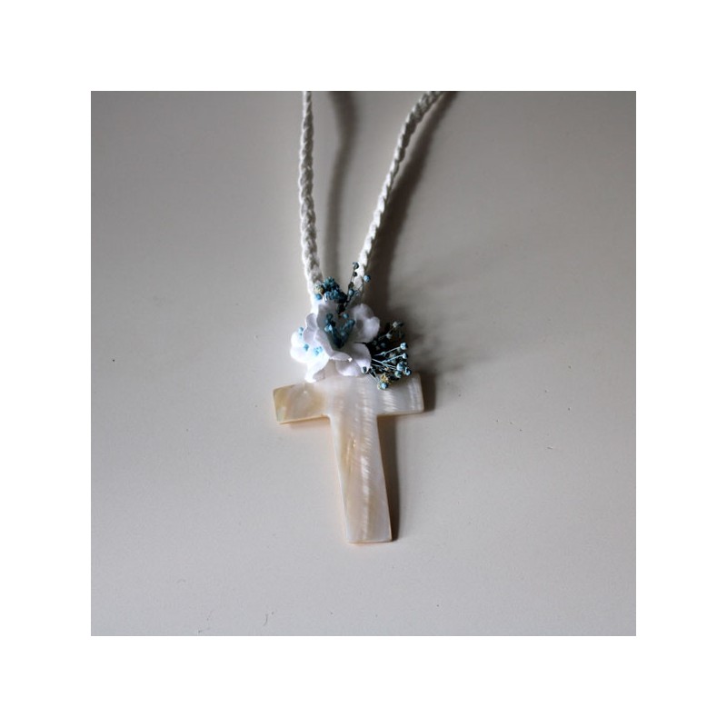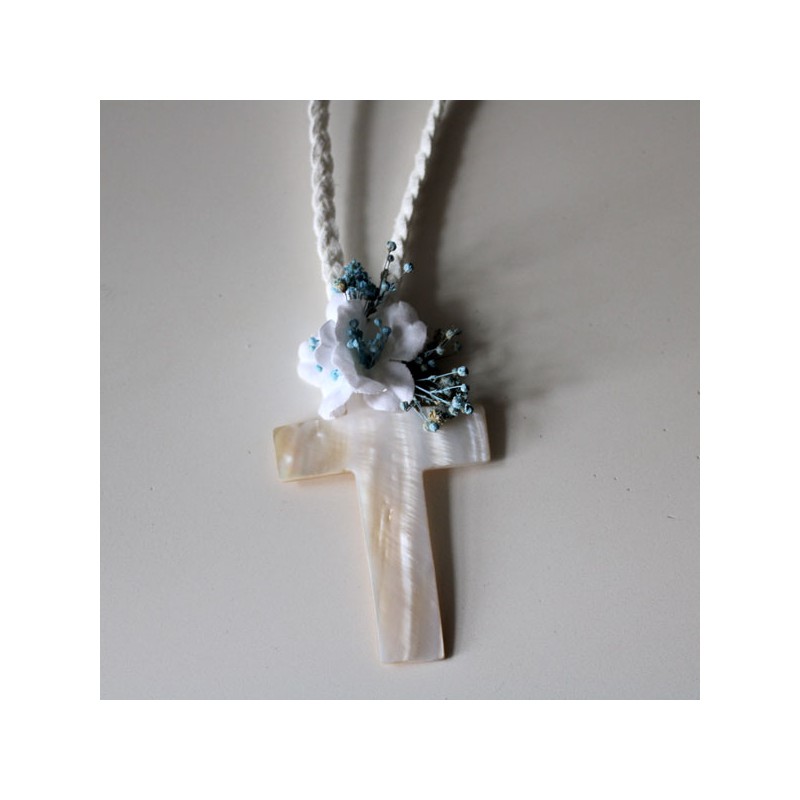 Big cross nacre with vanilla and blue flowers for girls first communion.