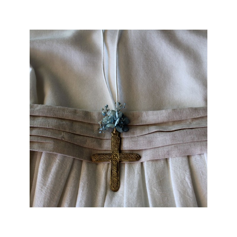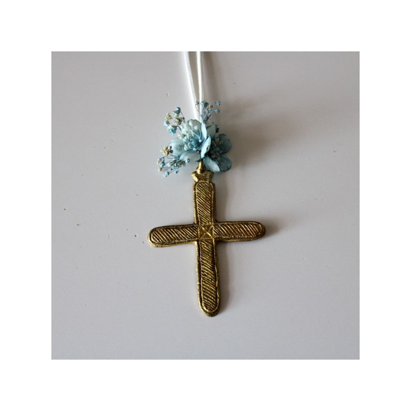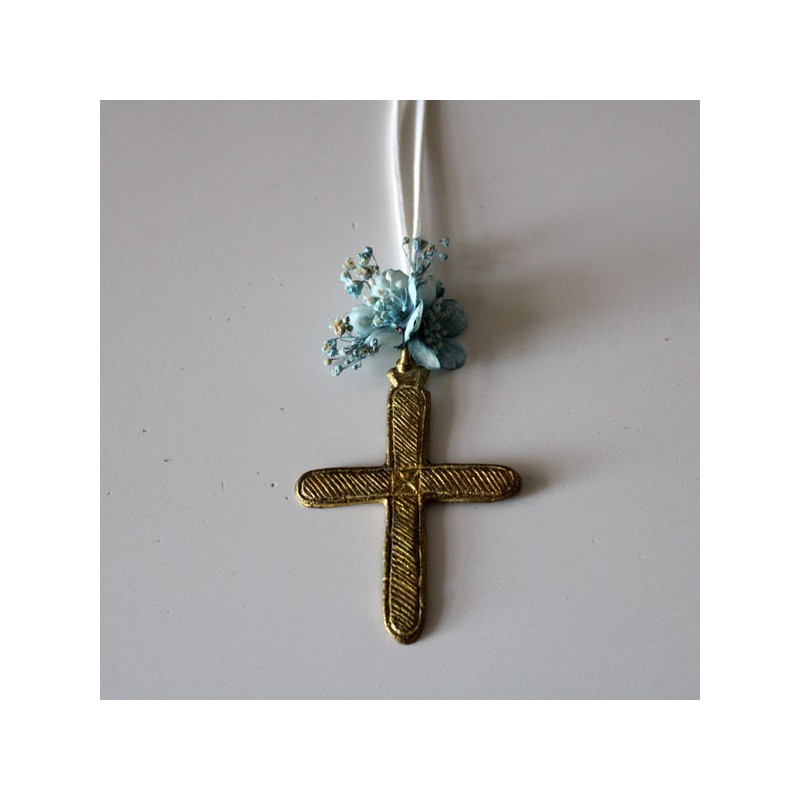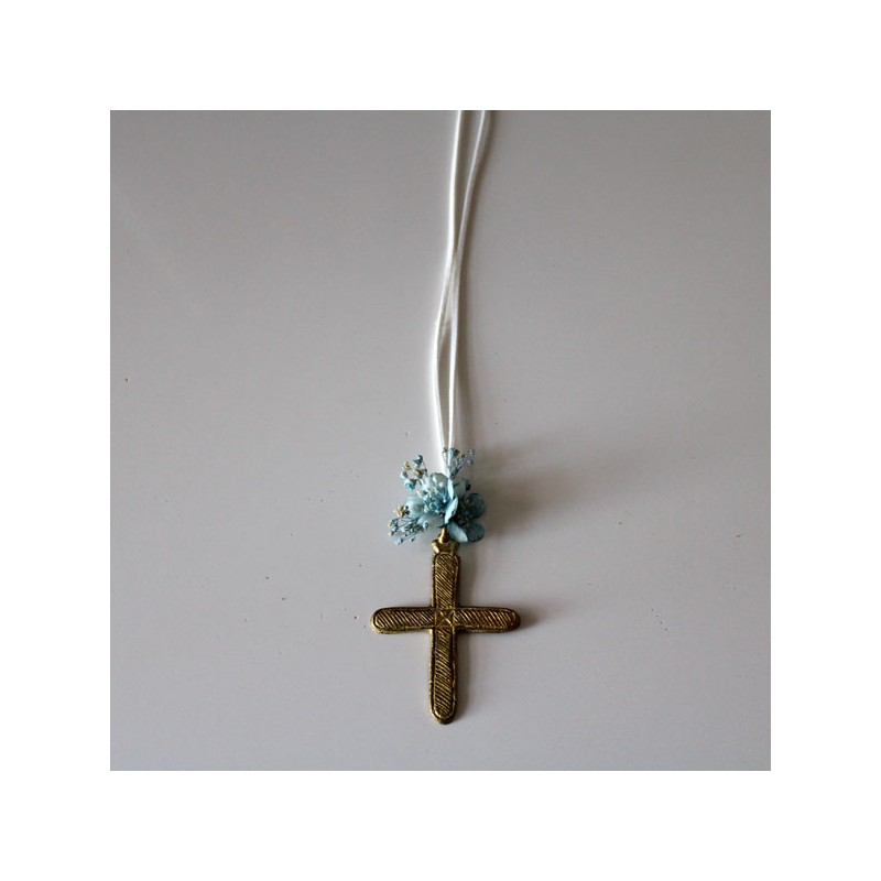 Metal golden cross with blue mini flower and white suede cord for girls of first communion.
