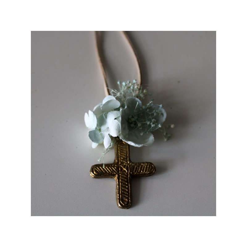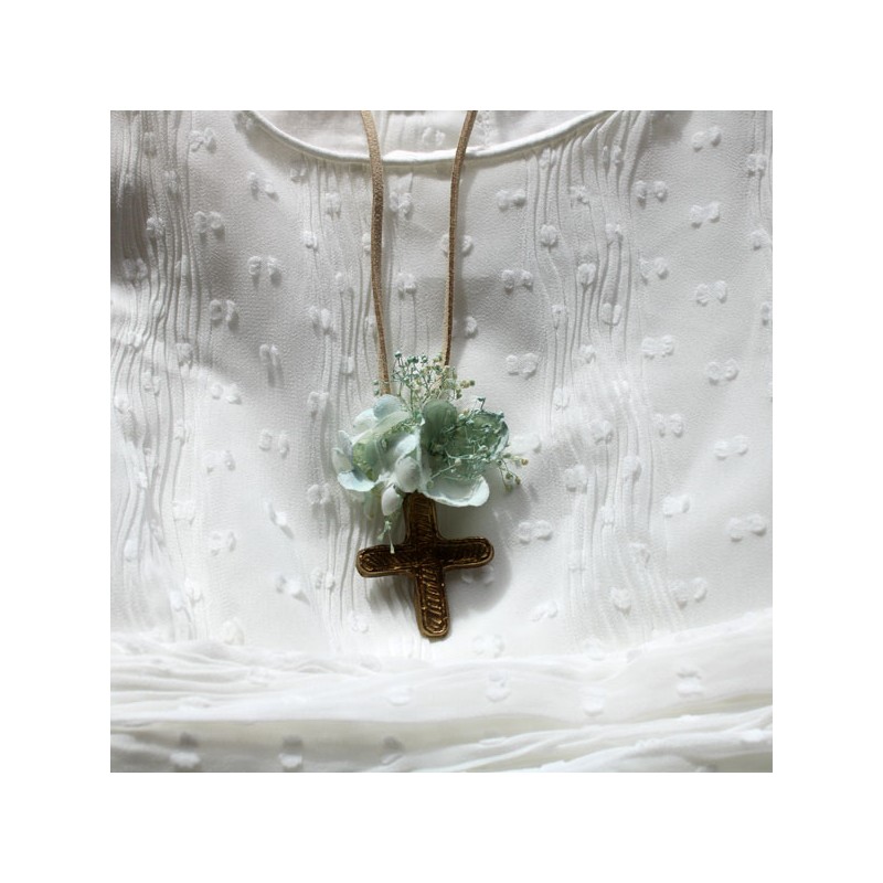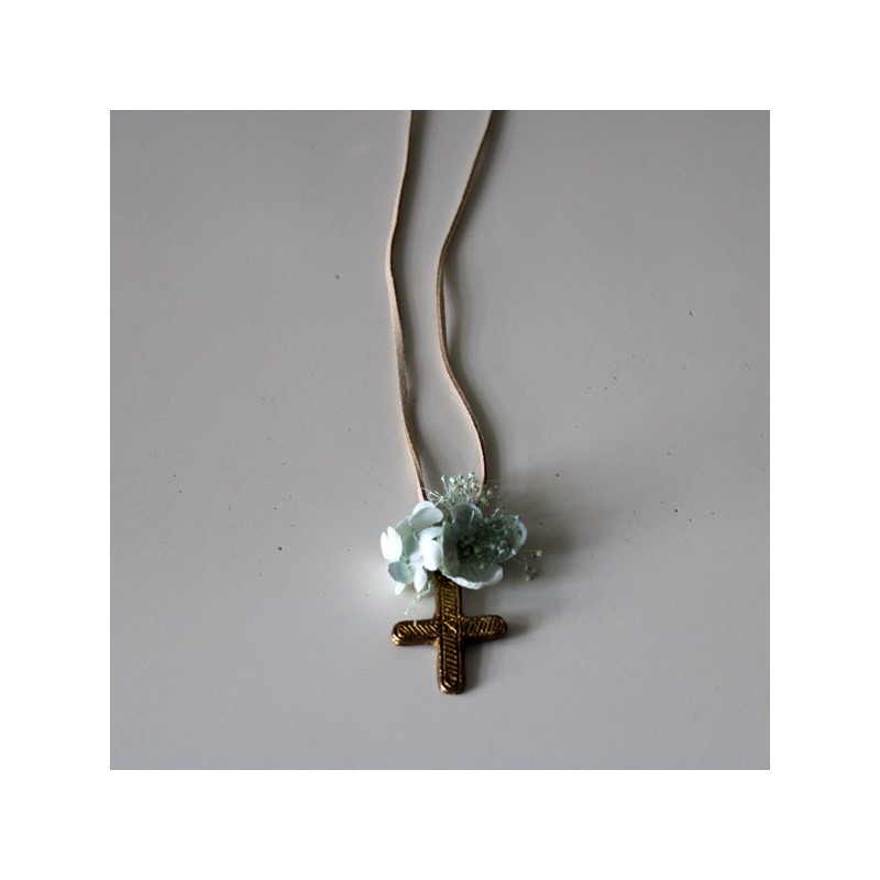 Small metal golden cross with green mini flower and ivory suede cord for girls of first communion.