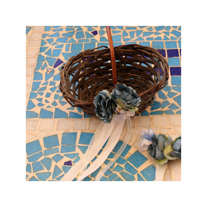 Oval basket for flower girls, decorated with rose flowers of blue tones.