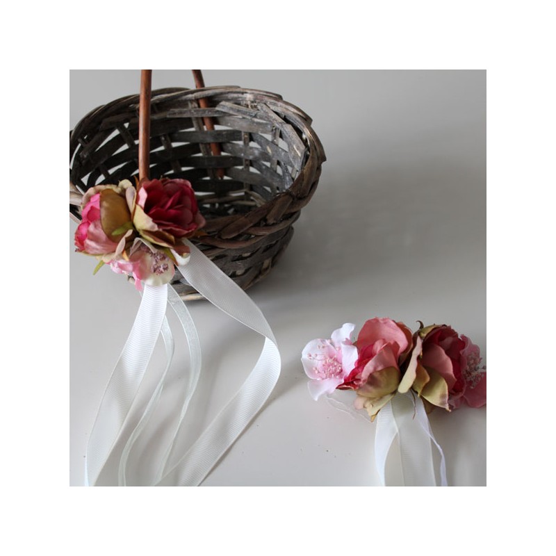 Round basket for flower girls, in a natural tone and decorated with pink flowers .