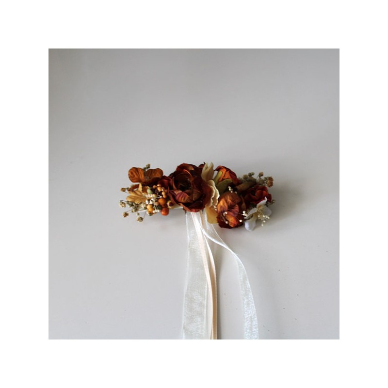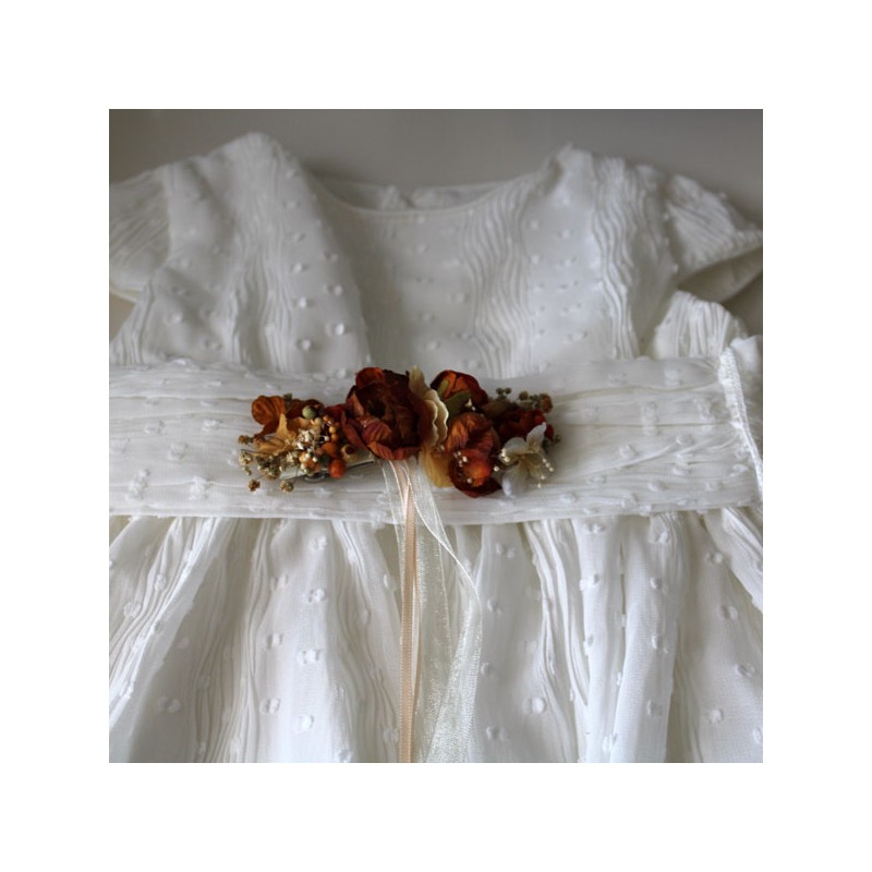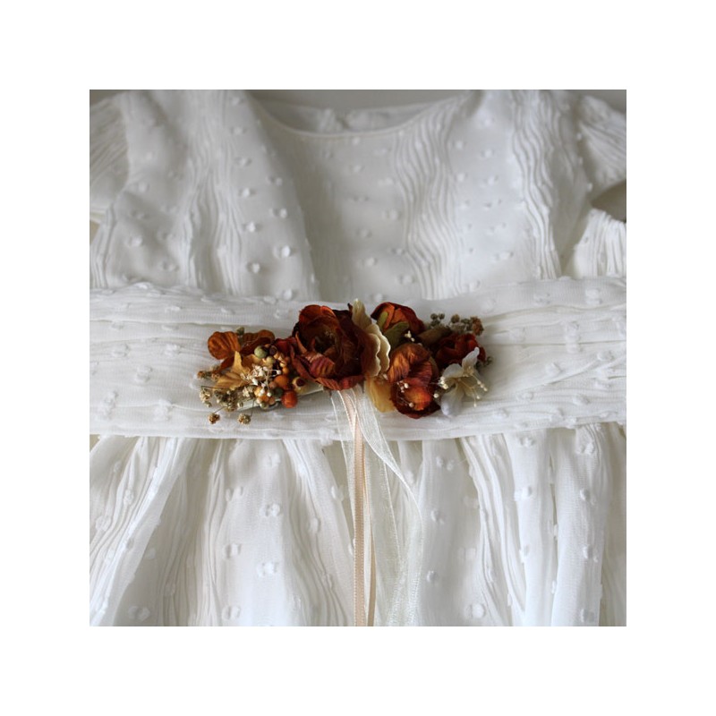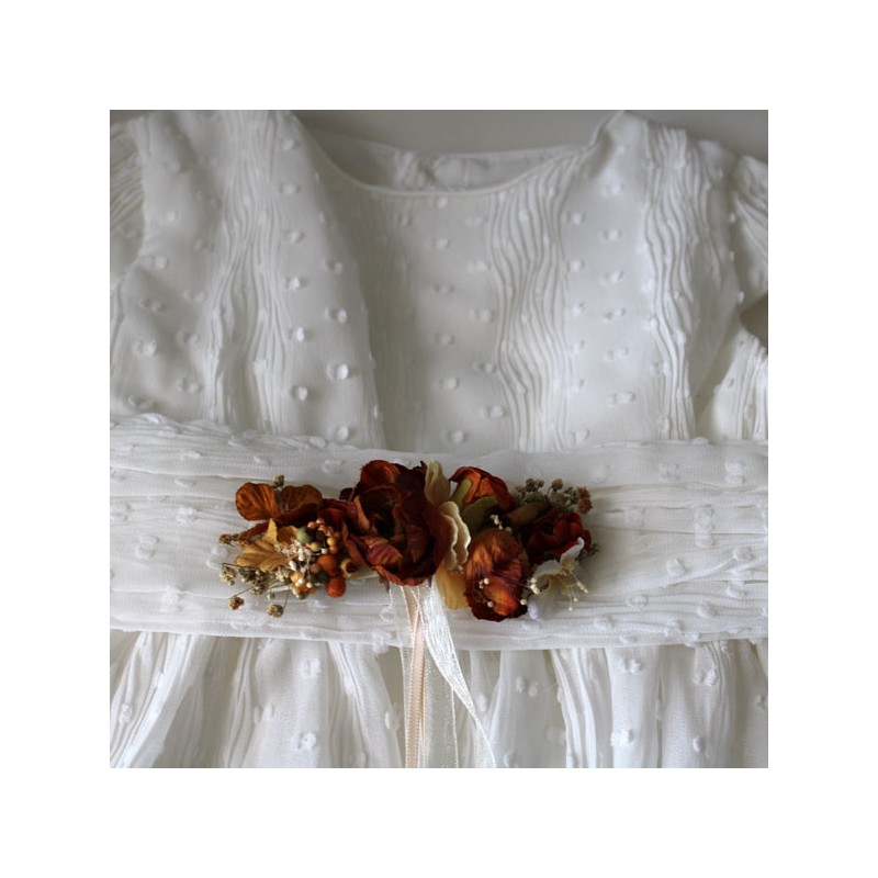 Dried flower belt of various types of flowers in brown tones for flower girl .