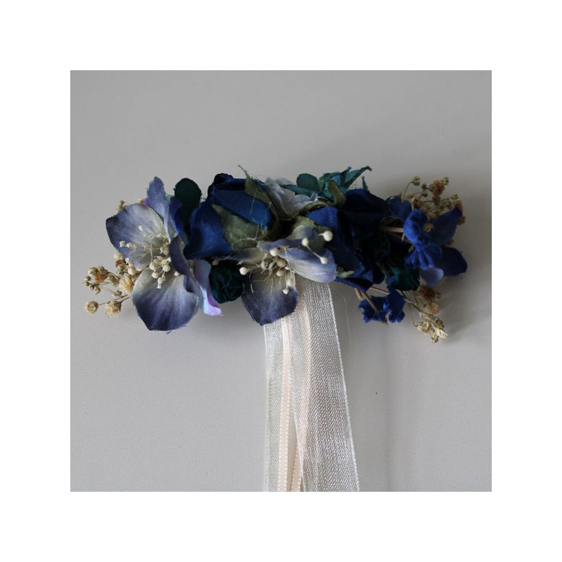 Dried flower belt of various types of flowers in dark blue tones for flower girl .