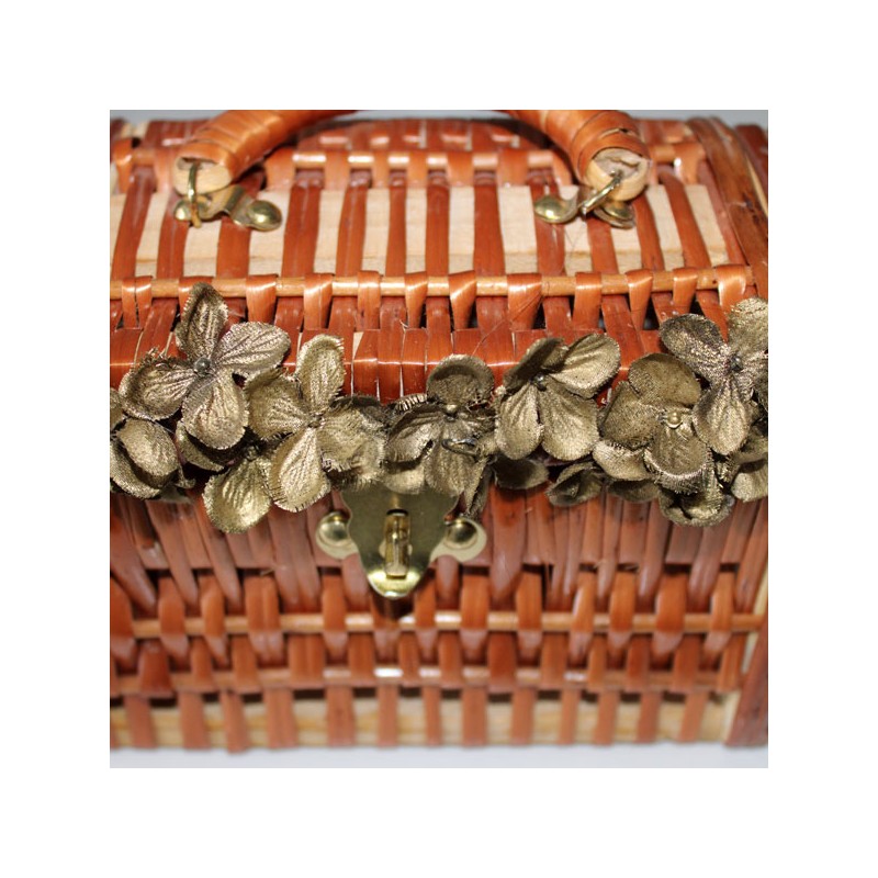 wicker bag with gold flowers. The flowers are made of golden fabric.