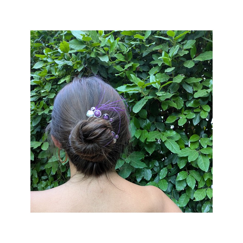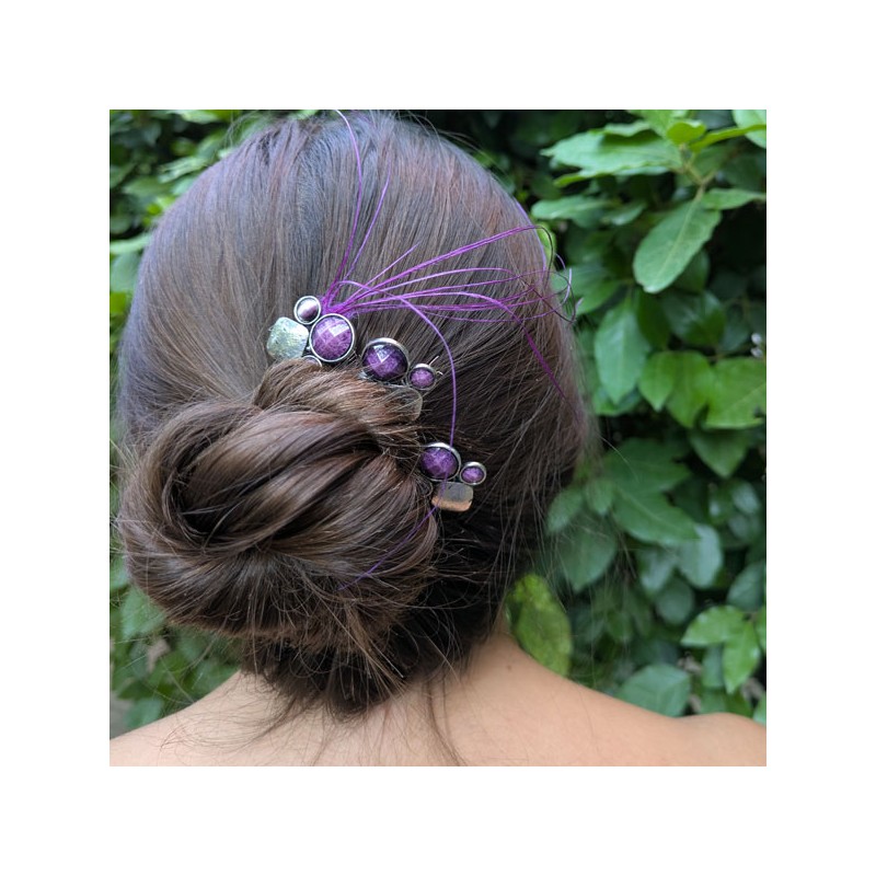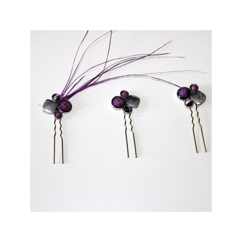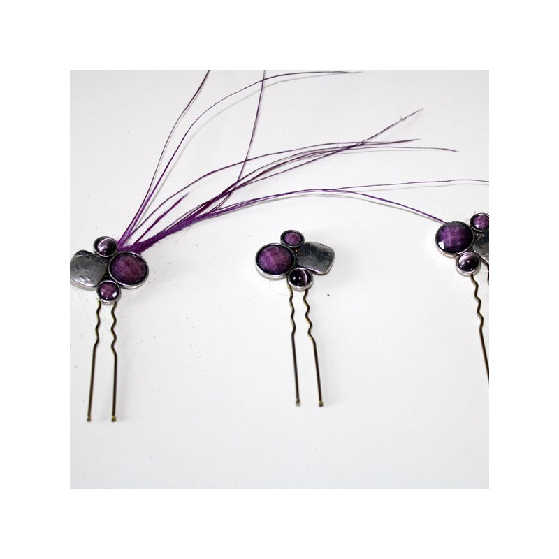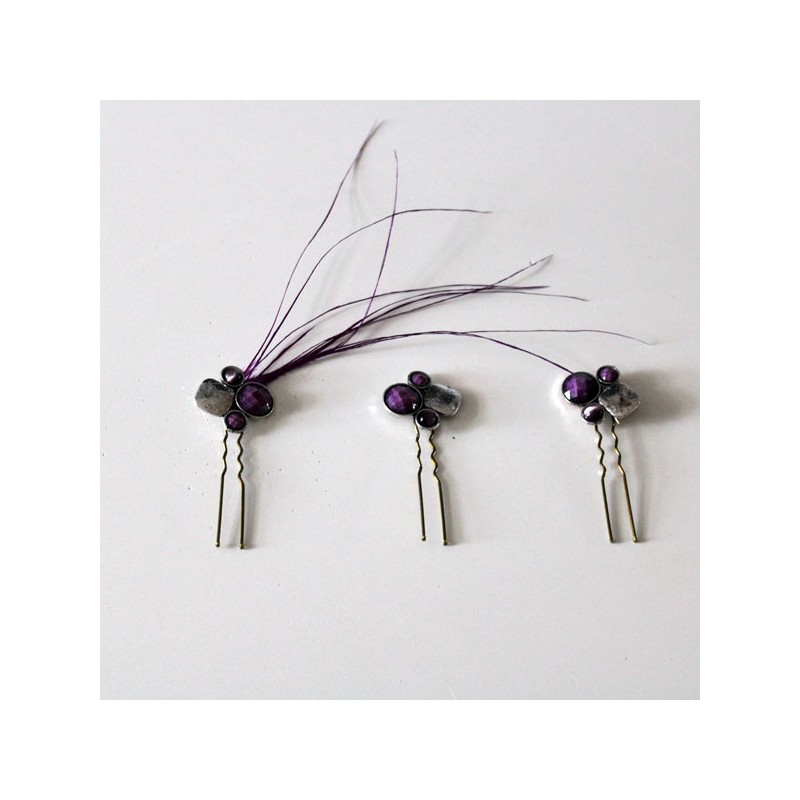 3 Horquillas de moño con piedra morada: Dos horquillas sin adorno y Una horquilla con plumas de rafia.