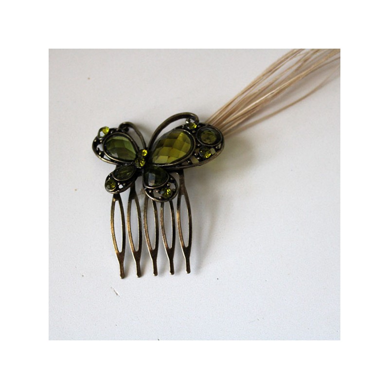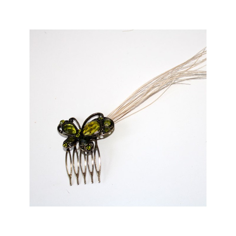 Peineta con mariposa dorada y piedras verdes con adorno de plumas de rafia marfil.