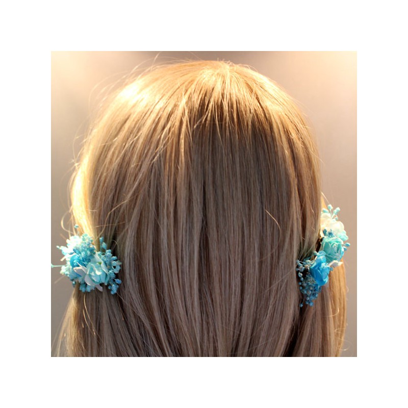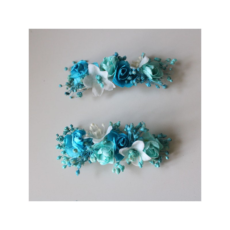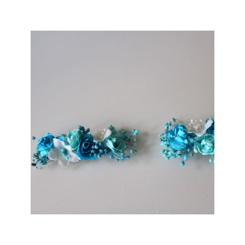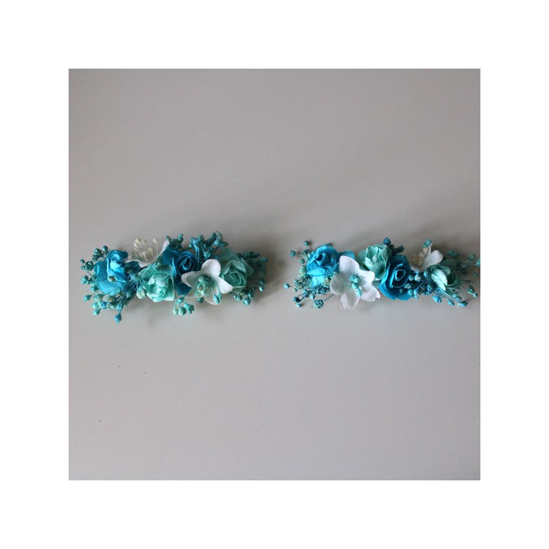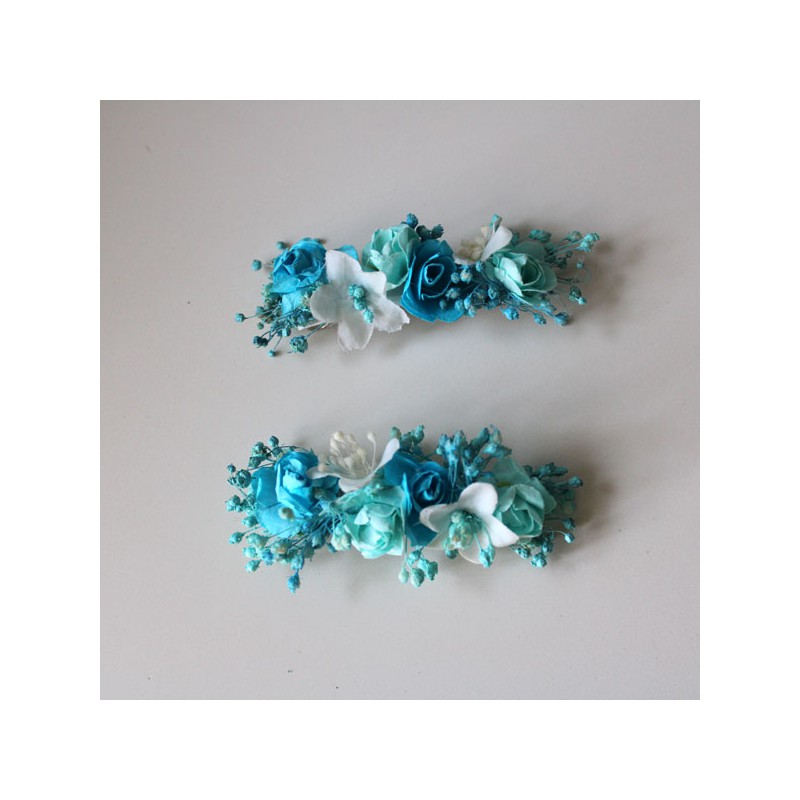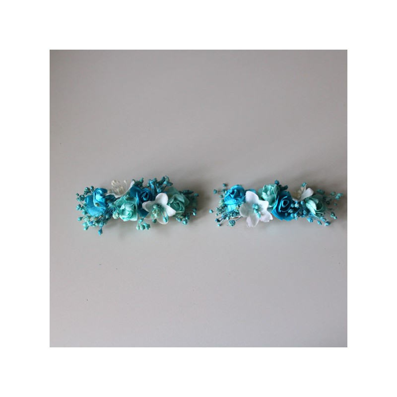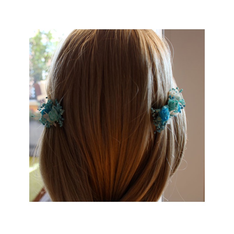 Dos pasadores medianos de diversos tipos de flores en azul turquesa para niña acompañante, invitada y arras.