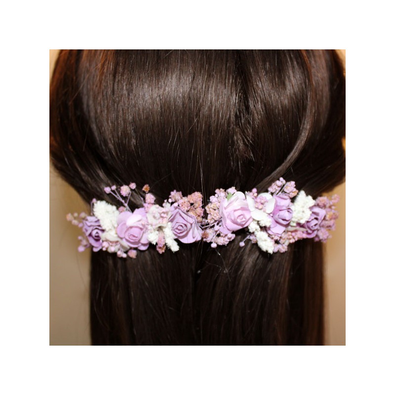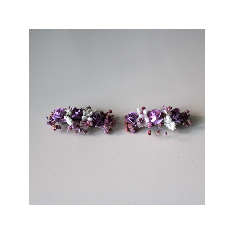 Dos pasadores medianos de diversos tipos de flores en malva palido para niña invitada, acompañante y arras.