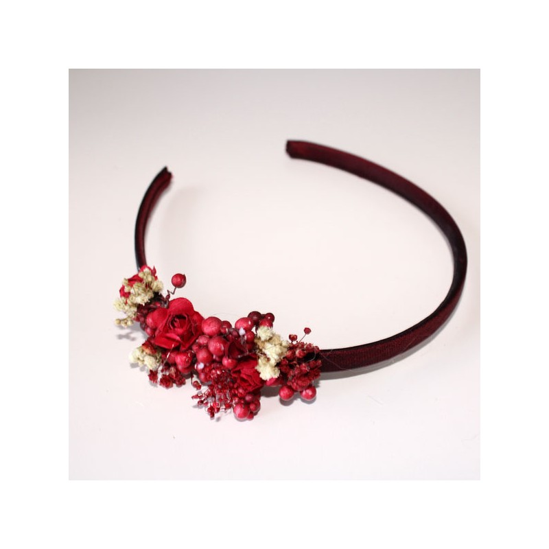 Diadema estrecha de flores laterales en tonos granate y guinda.