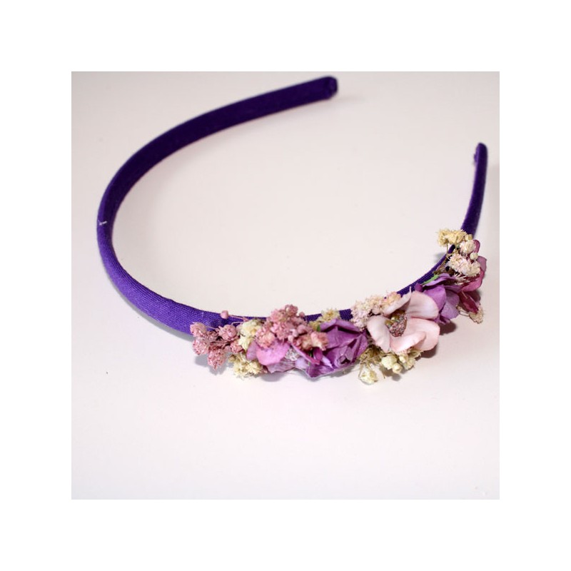 Diadema estrecha de flores laterales en tonos morado y lavanda.