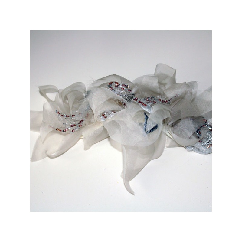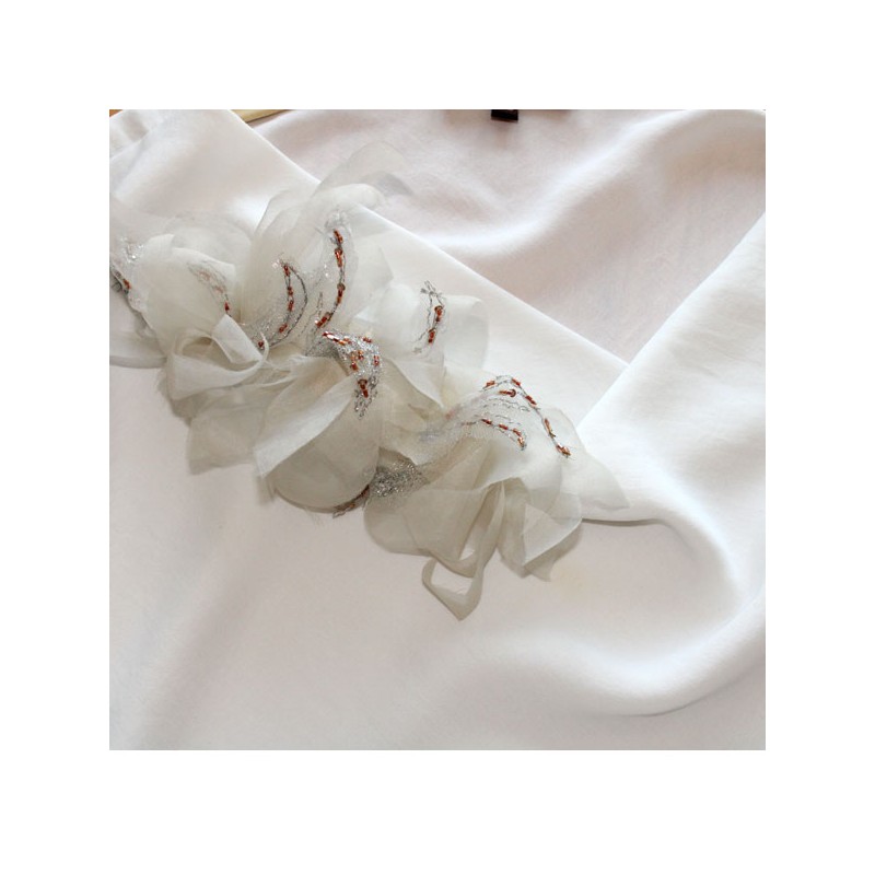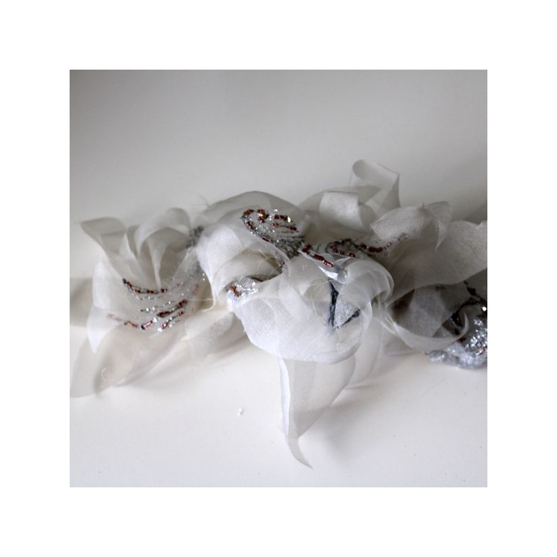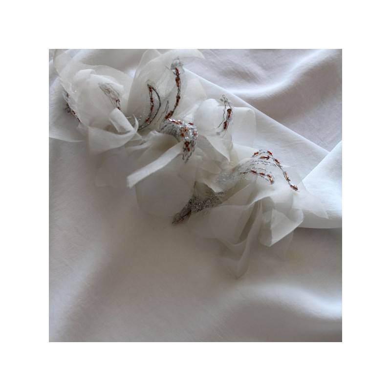 Tocado de hojarascas para adornar un vestido o para un peinado. Hecho de tela moldeada en tonos piedra plata y cobre.